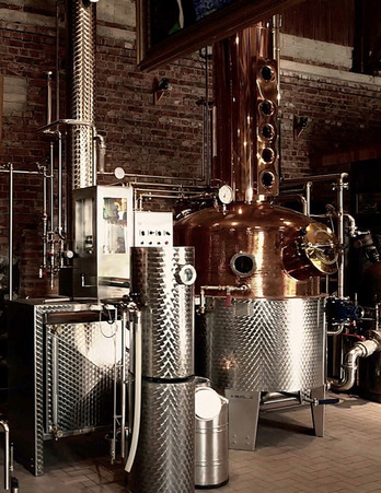 Next, we heat the mix in copper stills. The heat causes the alcohol and oils evaporate, separating them from the solid botanicals. The vapour rises, cools, and turns back into a liquid, now full of botanical flavors. We collect the distillate in fractions, keeping only the "hearts" for the best taste.